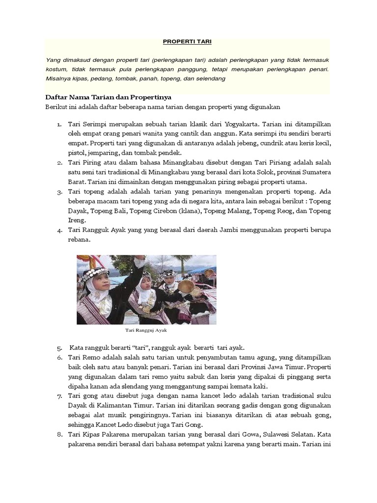 Lampiran 8 Soal Ulangan Harian from imgv2-2-f.scribdassets.com Fungsi properti dalam seni tari : Tari cakalele maluku tarian perang tradisional maluku sarat aura mistis. Kipas menjadi properti utama yang digunakan dalam tarian ini, dan sejak dulu hingga sampai saat ini, tarian ini menjadi sebuah tradisi yang terus berlangsung di kalangan masyarakat gowa. Ada beberapa macam gerakan kaki yang di dipakai pada tari pendet, diantaranya adalah tampak sirang pada, ngembang, ngandang areo, milpil, dan nyregseg. Tarian ini dilakukan dengan memainkan payung sebagai. Dikutip dari situs resmi kementerian pendidikan dan kebudayaan ri, unsur pendukung adalah sarana yang sangat berpengaruh banyak terhadap kesuksesan dan keberhasilan dalam pencapaian tujuan pada suatu pagelaran. Tuliskan jenis properti yang digunakan dalam tarian cakalele brainly co id Tari ini merupakan kreasi baru dari pengembangan dari tari renggarini di tahun 1960 oleh tokoh pembaharu tari sunda, raden tjetje somantri.